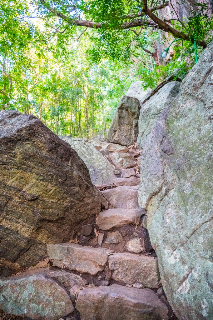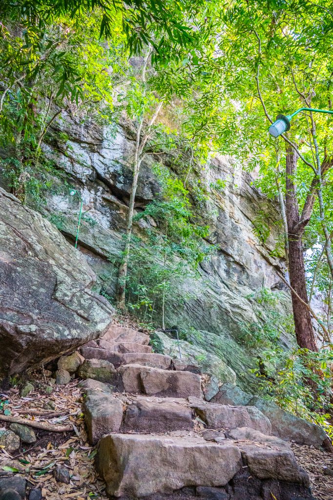 Från biljettdisken är det en kort promenad till man kommer till själva entrén. Därifrån går man genom en fin och öppen trädgård där man har den 200 m höga stora stenen rakt framför sig. Men då jag var här tidigt på morgonen så såg jag inte så mycket av den då det var så mörkt. Efter en stunds promenad kommer man till de första trapporna och då är det bara att börja bege sig uppför. När man passerat den första biten kommer man fram till en platå där själva ”gaten” till Lejonklippan finns, det så kallade Lejongapet. Där kan man andas ut en liten stund och studera de två tassarna som vaktar ingången och trapporna som är nästa etapp.