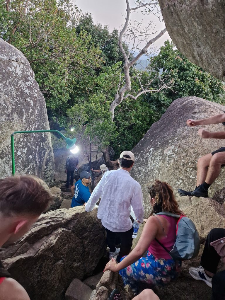 Nu är det bara den sista biten kvar som går på järntrappor upp för berget. Det går verkligen rakt upp och det kan vara ganska utmanande, speciellt om man är höjdrädd. Men sen är man till slut äntligen uppe på toppen, totalt 1200 trappsteg senare. Det är en skön känsla. Nu var det bara att vänta på soluppgången.