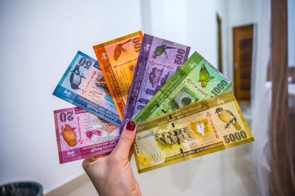 Valutan man använder på Sri Lanka är Sri Lankan rupees. När jag var här, november 2025, var 1 LKR = 0,0311 SEK. Jag brukade tänka att 1000 LKR var ca 30 kr. I princip alla hotell jag bodde på presenterade priserna på rummen i USD så jag fick be dem räkna om till rupees så jag kunde betala kontant.