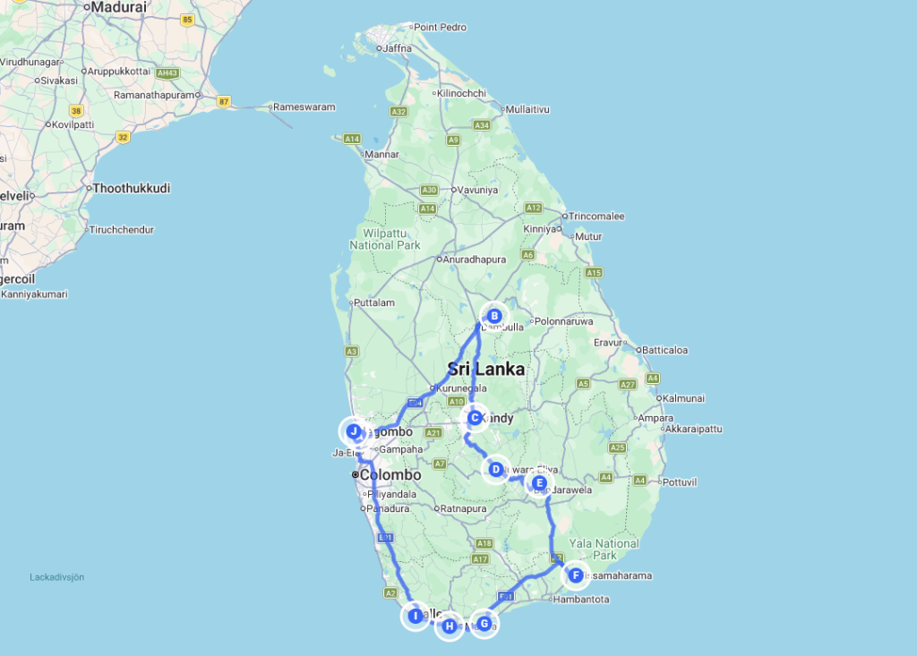 På kartan nedan har jag markerat hur min rutt såg ut. Jag hade en privat chaufför de första 8 dagarna på resan som tog mig från flygplatsen i Negombo (A) ända till Dickwella (G). Första delen av resan gick i ett ganska snabbt tempo med få nätter på varje ställe. De sista 9 dagarna spenderade jag på sydkusten i ett lugnare tempo. Då åkte jag tuk-tuk eller taxi mellan orterna.