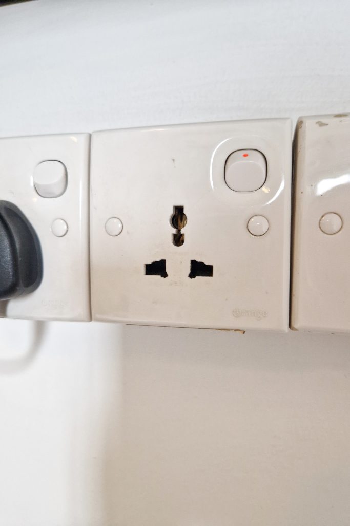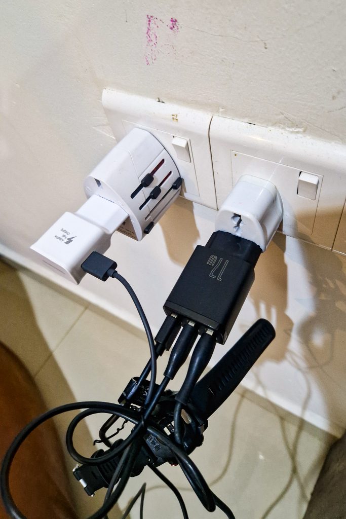 På de hotell jag bodde på och de kontakter jag kom i kontakt med var det typ G eller multiuttag där man kan stoppa i vilka kontakter som helst. Så man behöver ha med sig en adapter eller två på sin resa. Sen vill jag också tipsa om att skaffa en kontakt med flera USB-uttag, då kan man ladda flera saker samtidigt. Det behövs när det är mycket tech som ska laddas så som kamera, powerbank, mobil, surfplatta, klocka och så vidare och många hotellrum har en förmåga att ha få uttag.